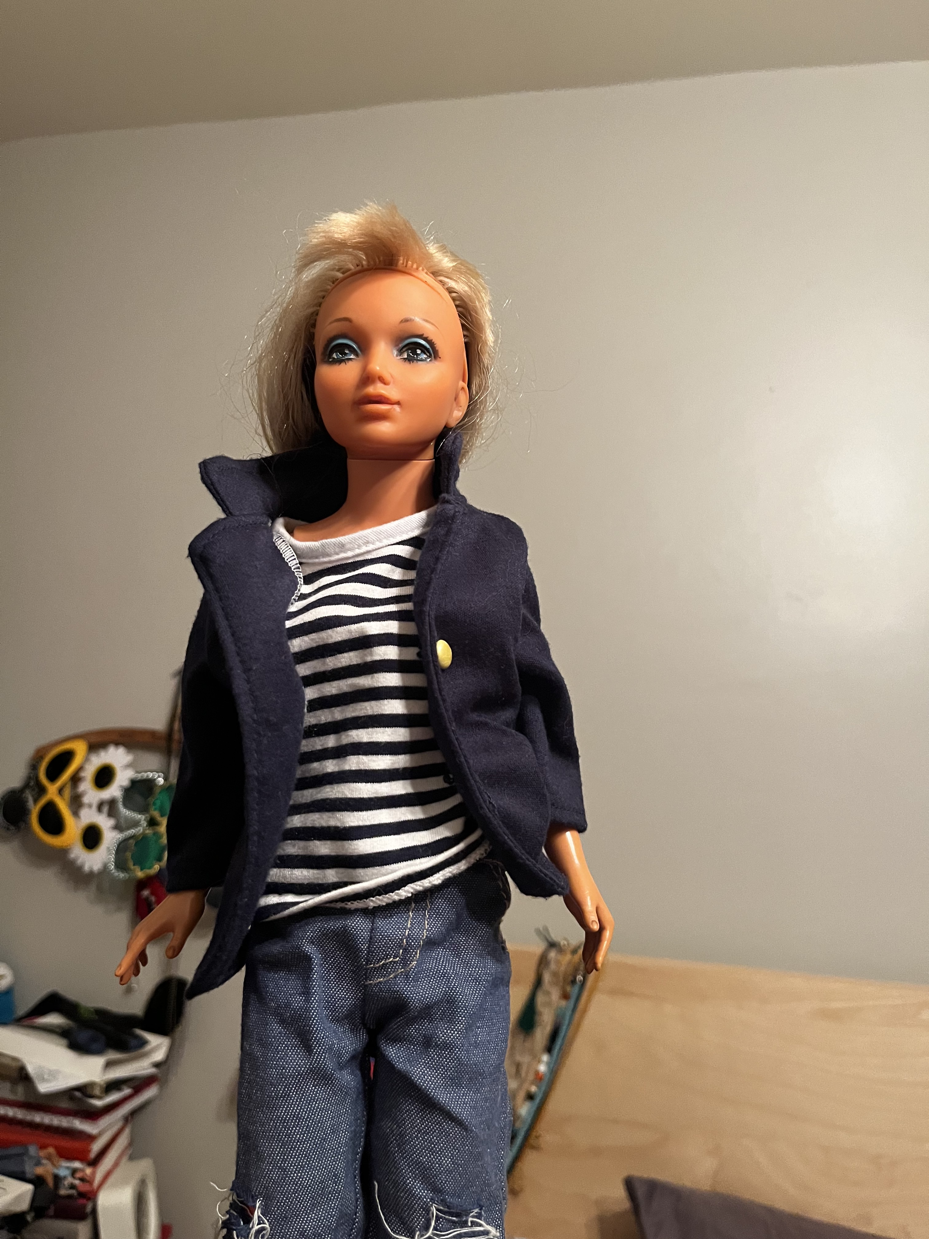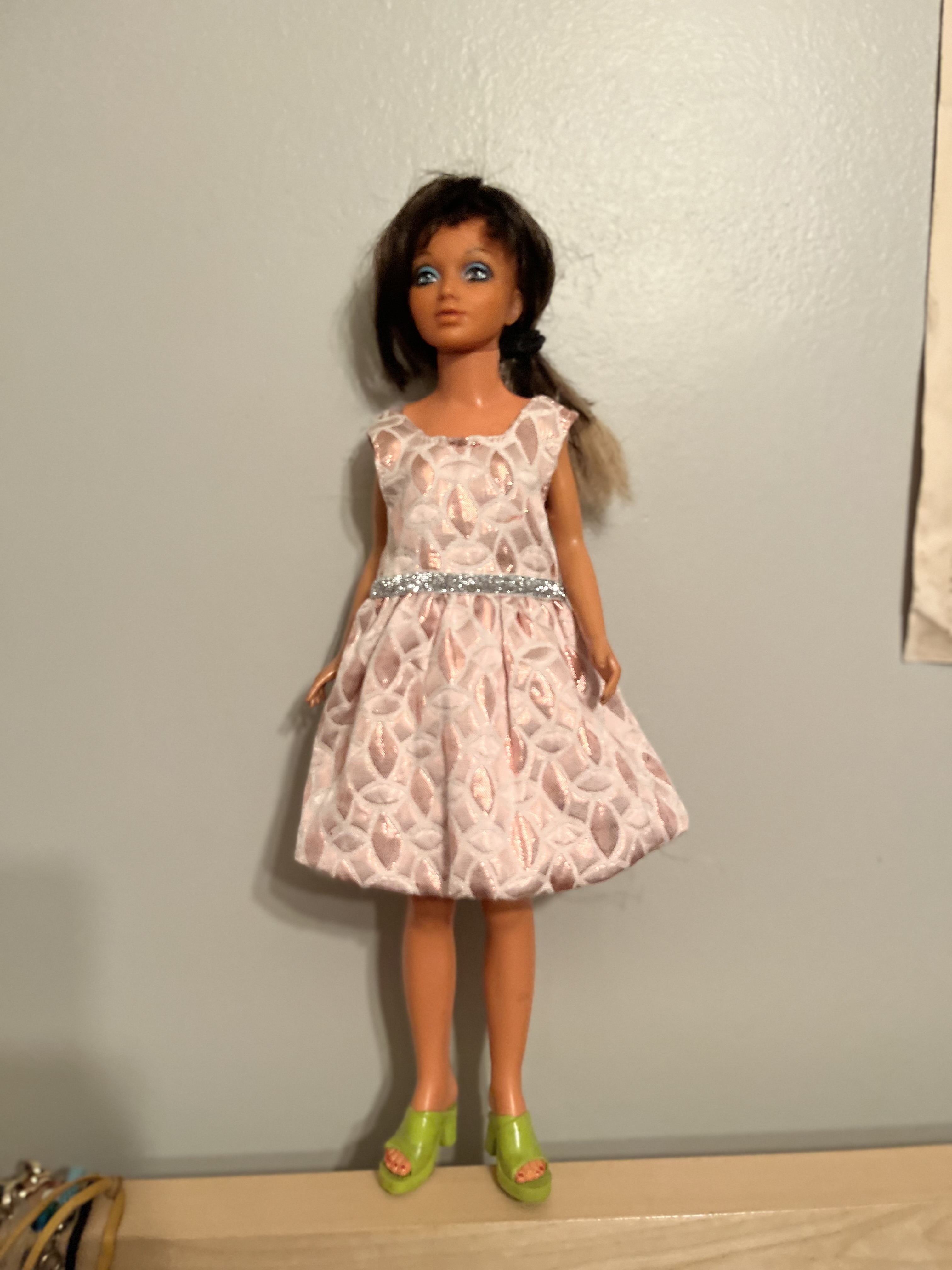 I immediately cleaned her up and detangled her twisty wig, but it has taken a lot longer to amass a wardrobe. I recently discovered that American Doll clothes fit (with a little alteration, anyway). And I’ve recently lucked out and found a few bags of them at the Value Village. Here are a few of my favourite fits.