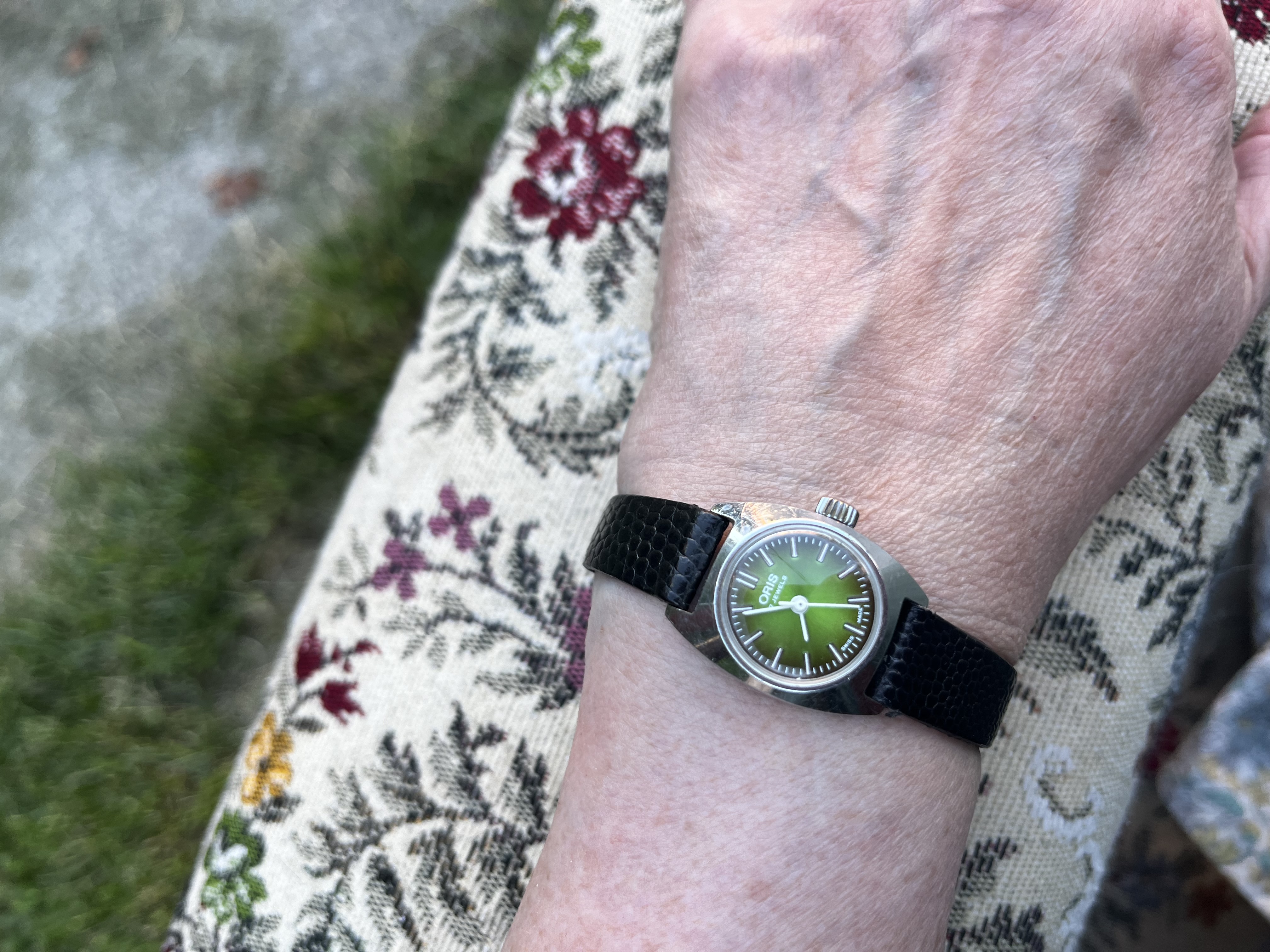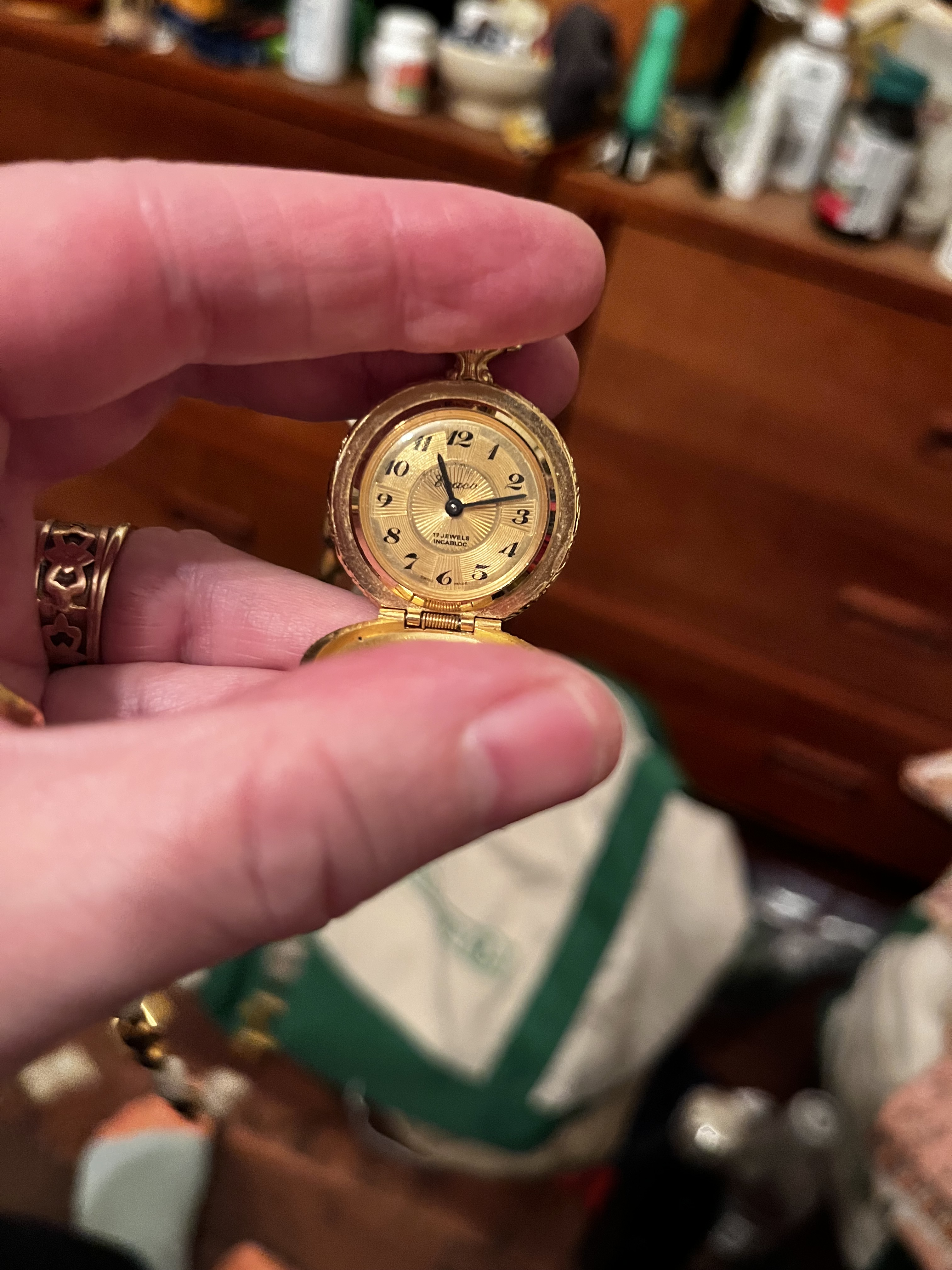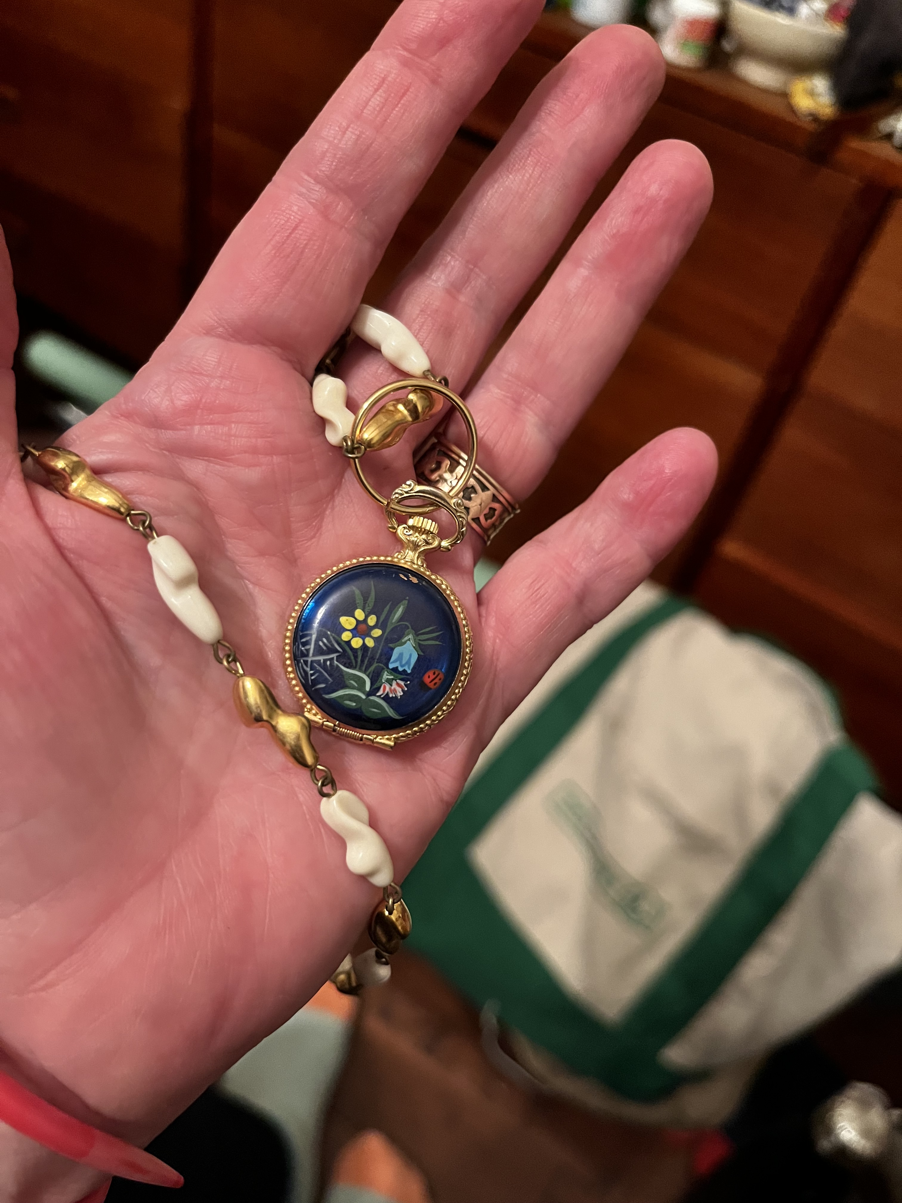 Lastly, I picked up this small pocket watch in KW yesterday. It’s from the 1970s made by a company called Evaco whose biggest claim to fame is that during the same decade that this tiny timekeeper was made, the brand also owned Angelus. It runs but keeps terrible time. But it was priced at $2.99, which is like pre-pandemic second hand pricing, and the hand painted decoration is very charming. I mean a bluebell and a ladybug! Who could resist.