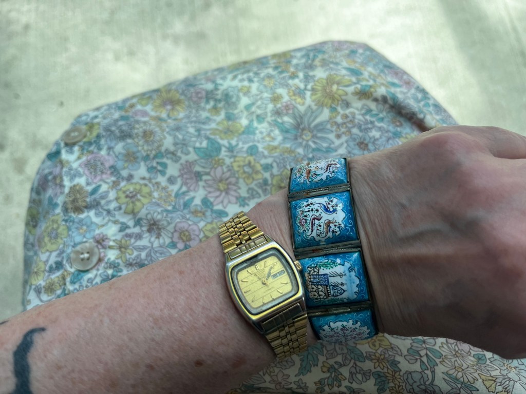 I’ve been on a hot thrift shop watch finding streak. All kinds of interesting pieces. Super cheap but they all need some TLC. The first timepiece I found is this funky Seiko 5 Automatic. It runs well but there’s a divot in the crystal and the crown comes off when you pull it out. My friend and watch repair enthusiast suggests a bead of crystal epoxy to fix the hole and some loctite to secure the crown. I’m a little scared to try this at home but at the same time the watch didn’t cost that much if I screw it up. Will have to order the supplies online. (The Persian miniature painting panel bracelet was another excellent find).