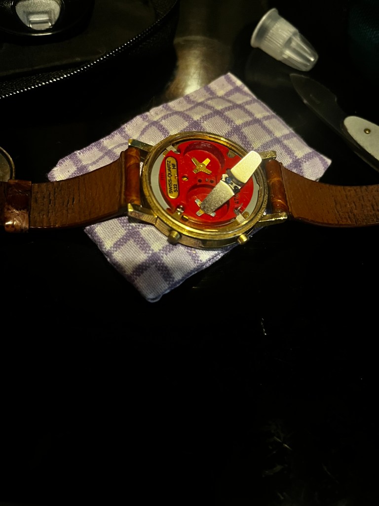 And yes, gentle reader, it was the real deal. according to Reddit, “Unlike nearly all other quartz watches this one features a jumping minutes hand that points directly to the current minute while the small LED display shows the seconds by depressing the bottom button, or the date and whether it is AM or PM using the top button. The watch uses an extremely unusual oblong 3 gear drivetrain to drive the hours hand (The hours hand moves very slowly for the first 30 minutes of each hour, and then very quickly for 20, then slowly again for 10. The watch also features electronically controlled quick set hours for quickly changing time zones while keeping accurate time, and according to the manual has a function Zenith touted as “synchronization mode” where the entire movement can be turned off and then reset on to perfectly synchronize it to the second with radio time, according to Zenith this was the first use of this feature on an analog watch.”