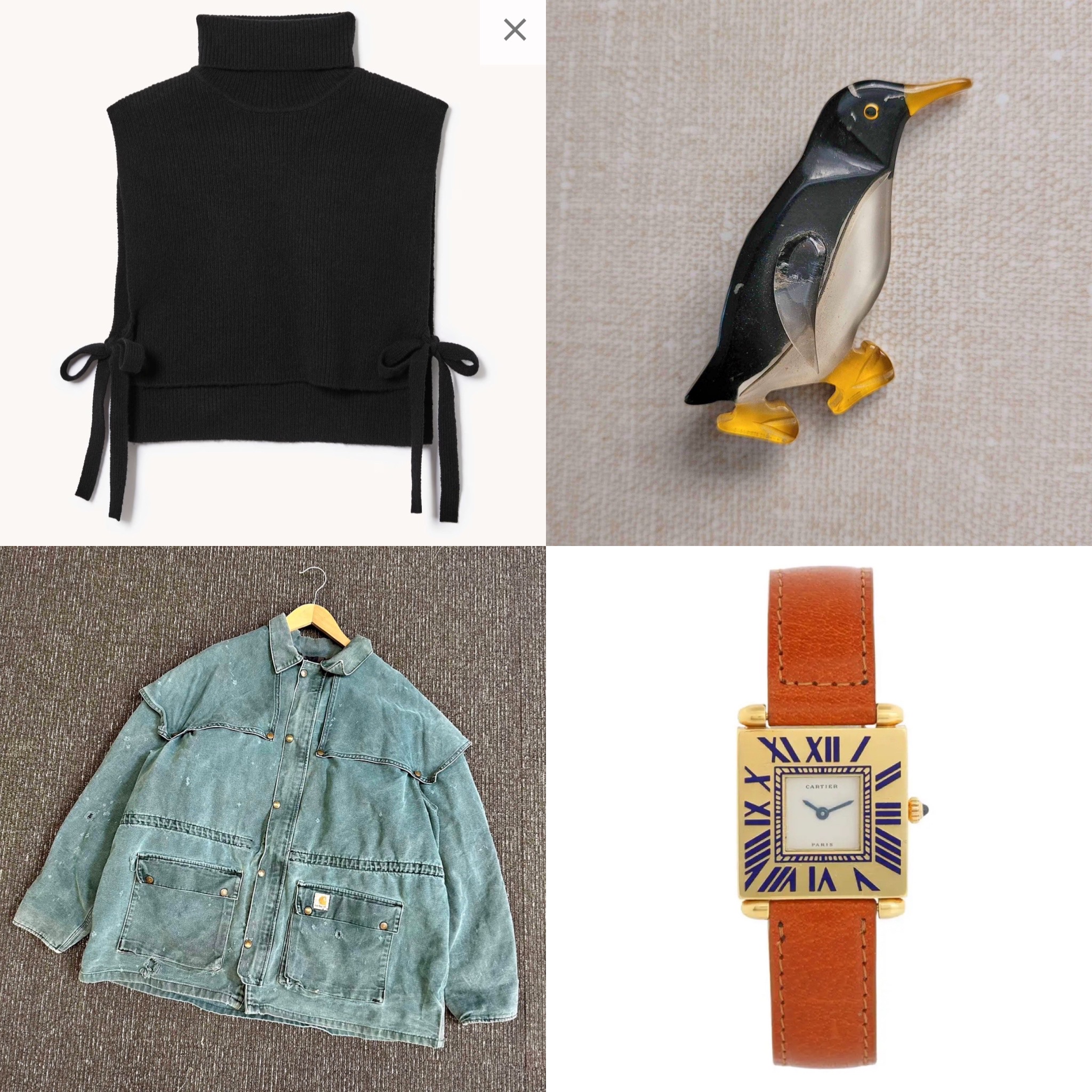 I forgot that I already had the penguin pin on a previous wishlist when I made this grid. And I’m too lazy to correct it. The Cartier watch is out of my league financially. The vintage Carhartt chore jacket probably doesn’t fit either my body or my budget. I did buy the black Dickie on the weekend. I convinced myself that was a great purchase because I could stretch my wardrobe by wearing it over summery shirts in the winter.