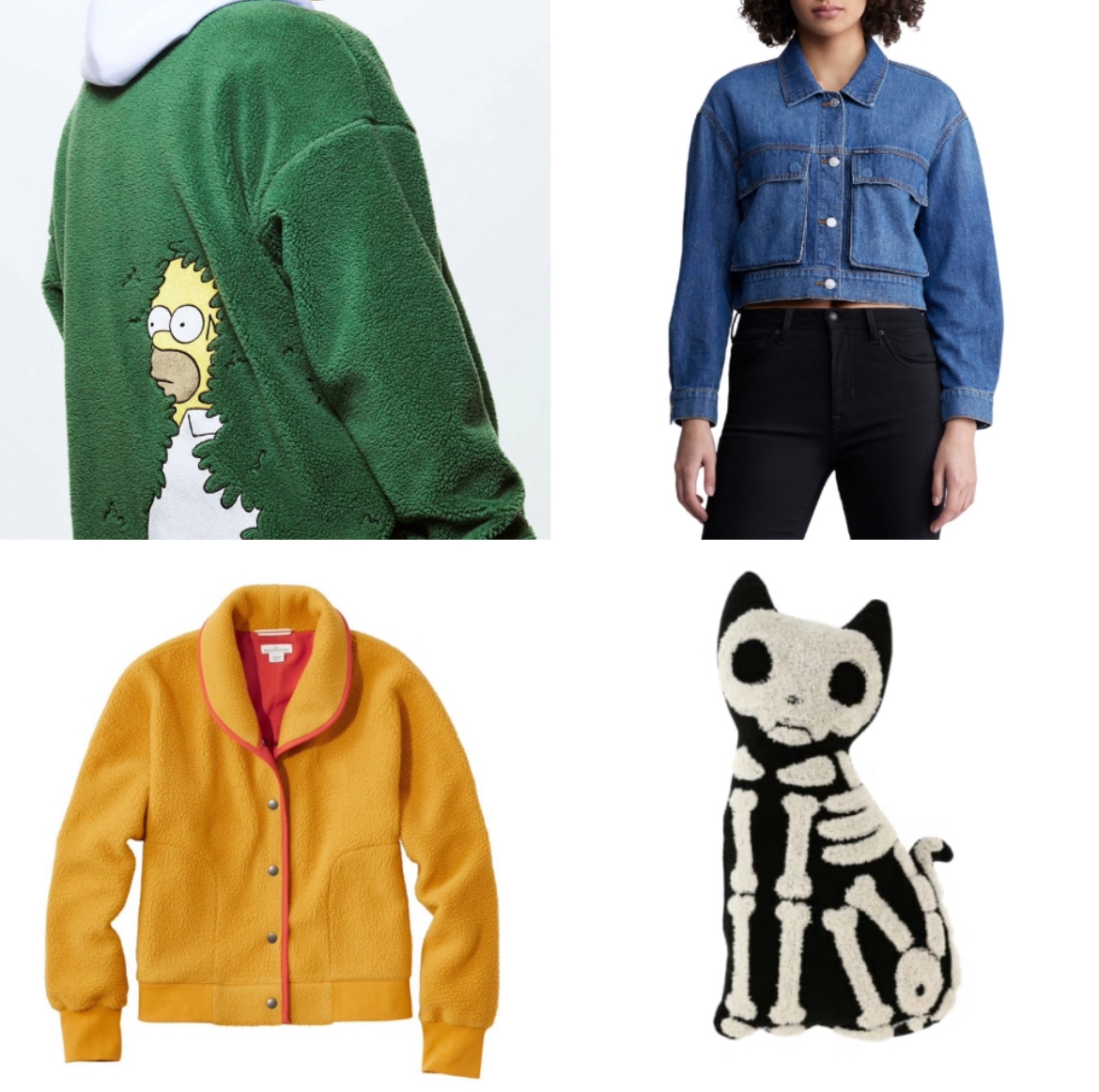 This is my second last list. I have already have Jean jackets galore, but this one from Levi’s is much better. I feel I need to atone for earlier rash purchases by denying myself the pleasure of a superior version. Likewise the mustard-coloured cardigan. I already have a perfectly good sweater but it doesn’t have a shawl collar like this beauty from L.L. Bean. The skeleton kitty throw pillow from 5 Below was out of stock when I last visited. And I forget where the Homer disappearing into the bushes jacket came from.