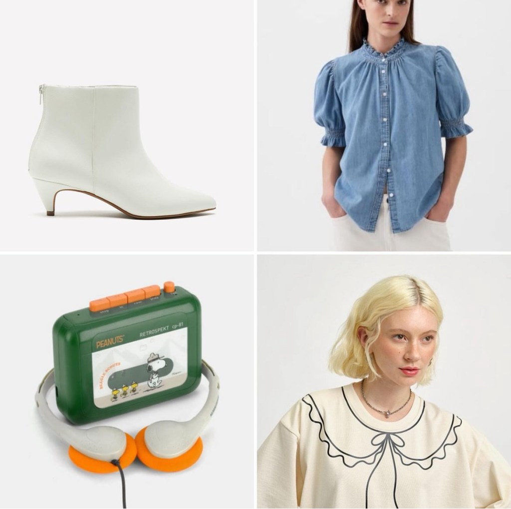 The trompe l’oeil t-shirt is by Eliza Faulkner. As of writing it is still in stock. The Chambray shirt was from the Gap. It is long gone but I hope it might pop up again on the secondary market. The boots are basically the white version of my beloved red Fiorucci Love Boots. Heels and pointy toes are exactly the kind of footwear my chiropodist has forbidden me from ever wearing again.