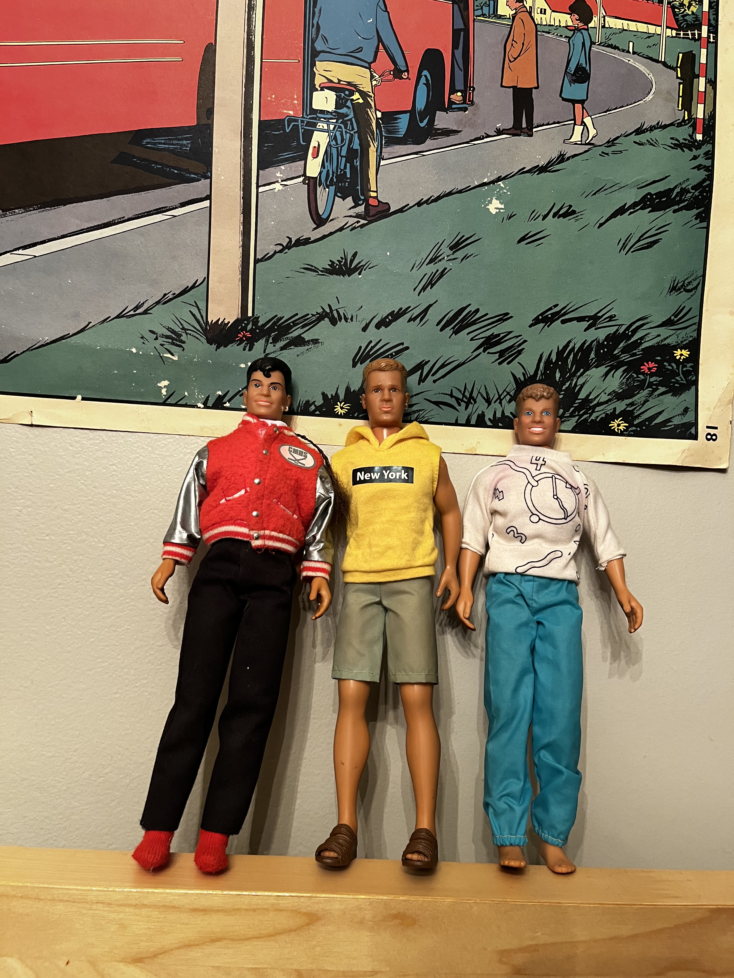 Any way, I cobbled together fully dressed looks (except for shoes) so they could hang out with the other celebrity dolls. A fun fact, I found the bomber jacket in a bag of vintage Barbie clothes a ways back. Turns out belongs to Joe, but I’m letting Jordan wear it for a spell because it matches his hosiery.