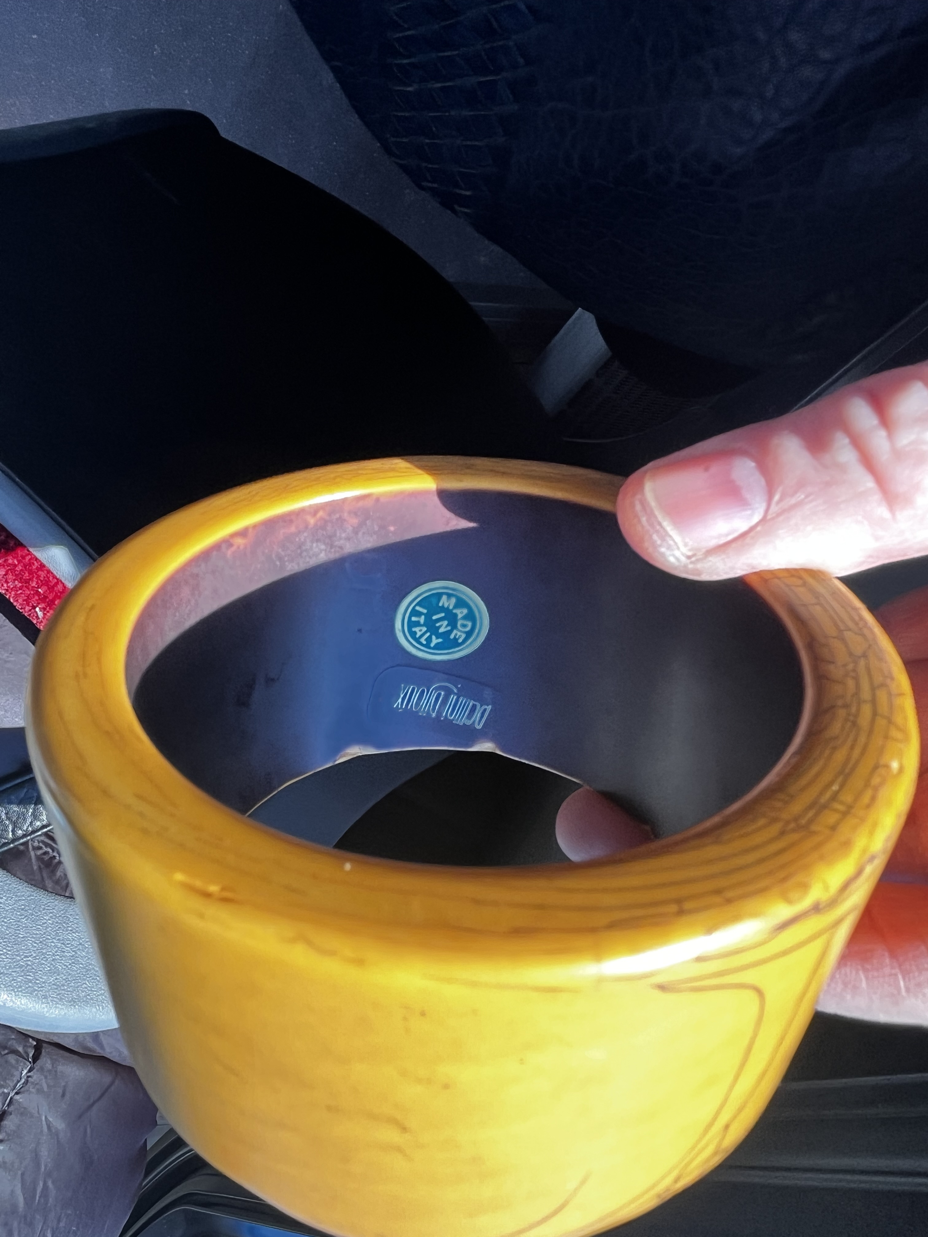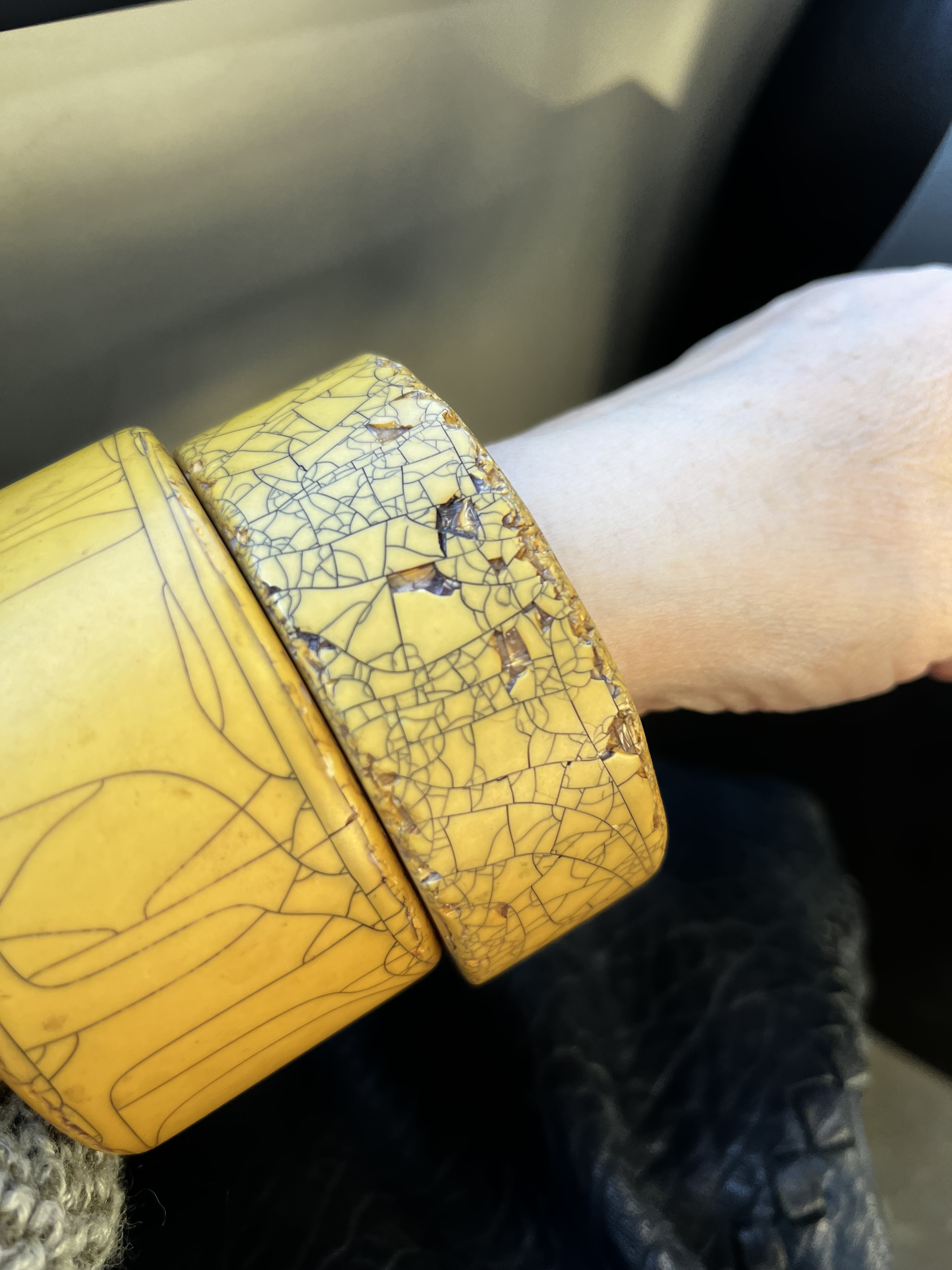 And this stack of resin bangles by Italian Donatella Pellini, a pioneer of plastic jewelry design. The problem with thrift shop scores is that sometimes the finds have conditioned issues. A perfect piece might sell for $350 on 1st Dibs. These chipped bracelets would probably bring in $100 on a good day (if I were to sell them). Still, a profit on the $5.99 I paid. Plus, I get the fun of examining them first hand, which only expands my research base and makes me better at spotting fancy goods.