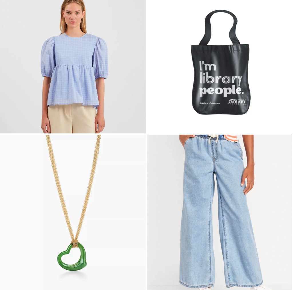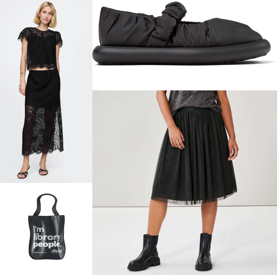 Above, clockwise from to left: lacy seperates from the Gap; Camper Mary Jane’s; a Joe Fresh tulle skirt; and a Toronto Public Library tote bag.