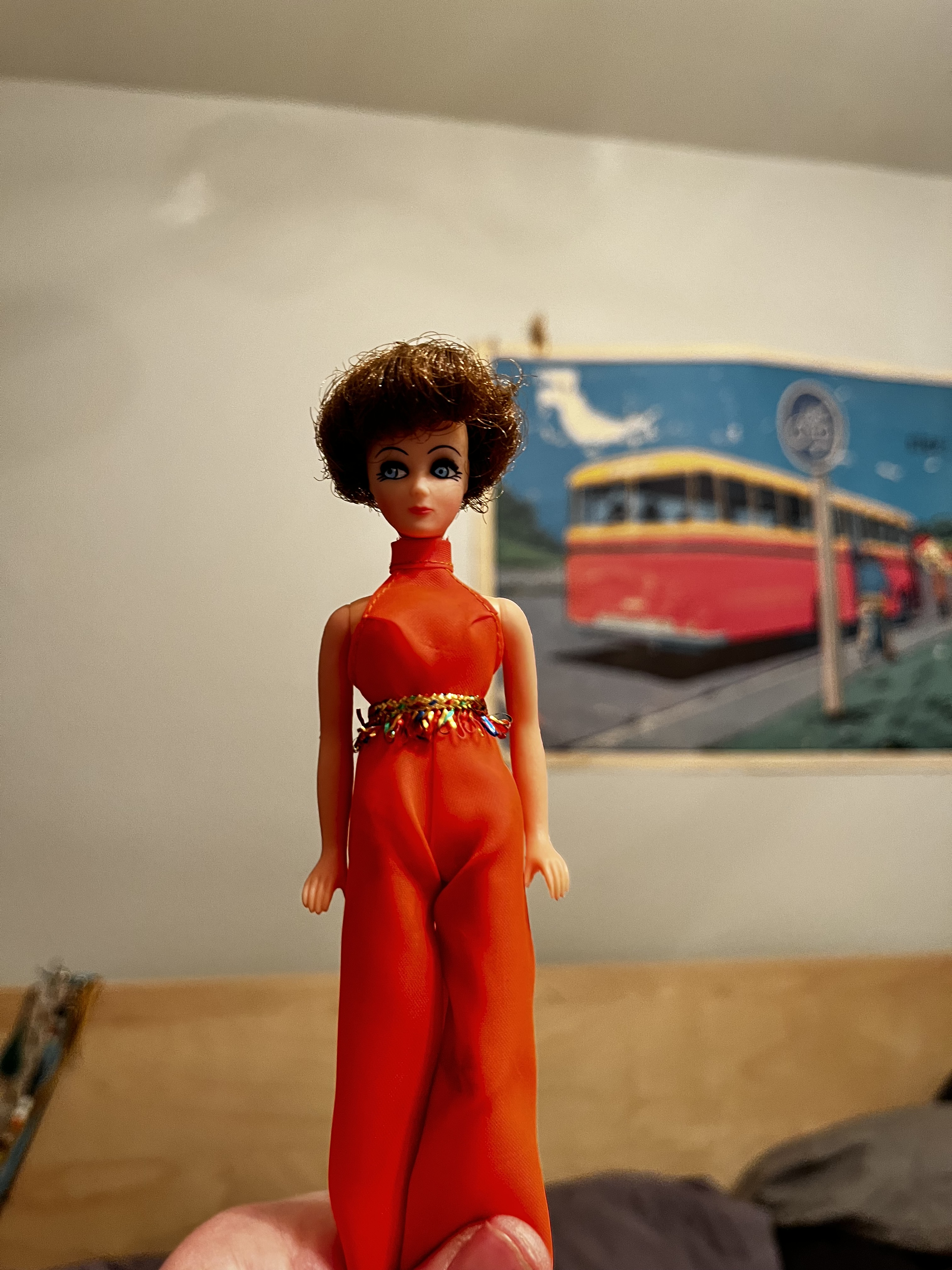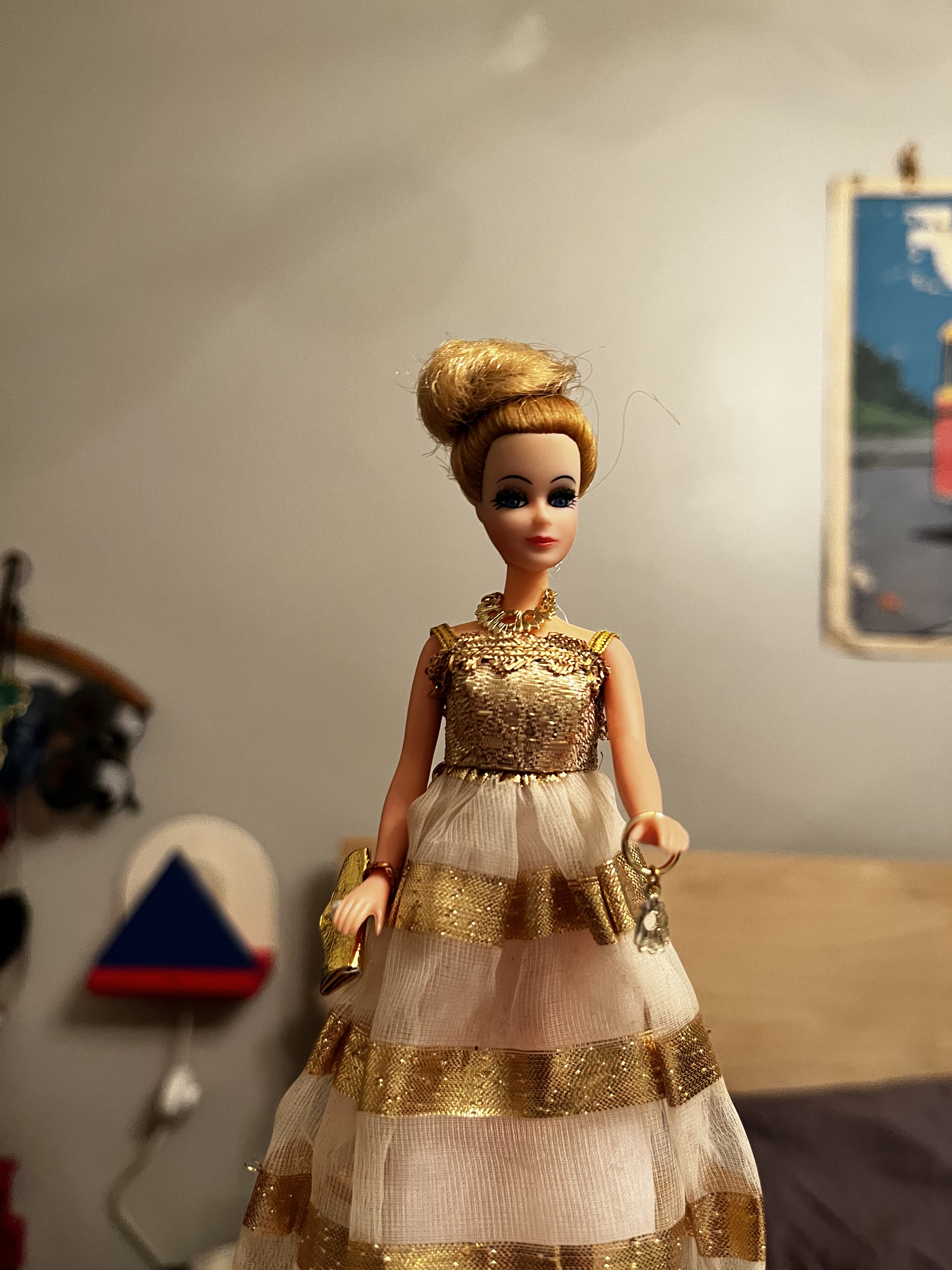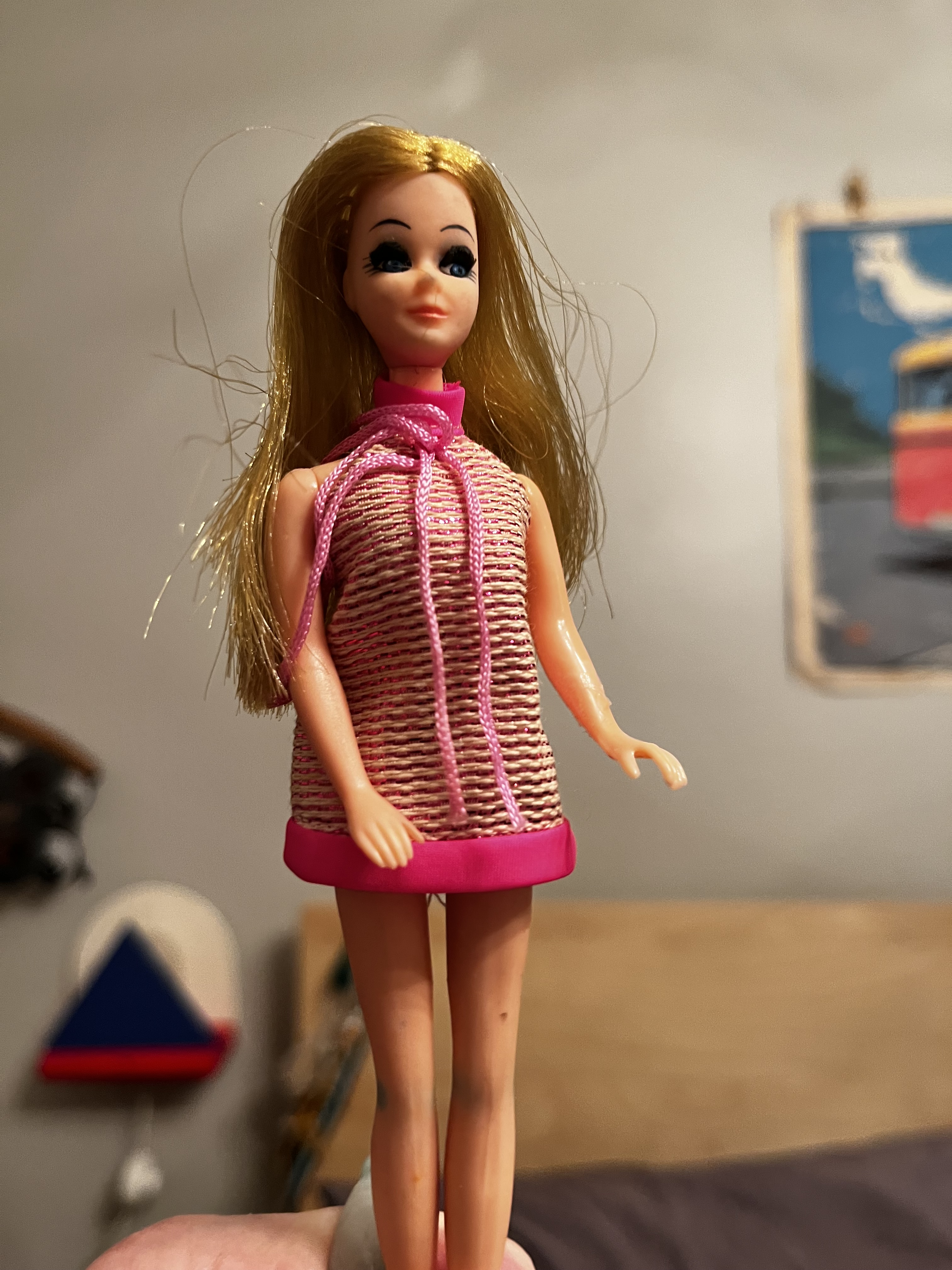The lady pictured up top even has her original jewellery and clutch. She is missing her shoes though. The Dawn shown above as the weird green knees that old bendy dolls sometimes get.