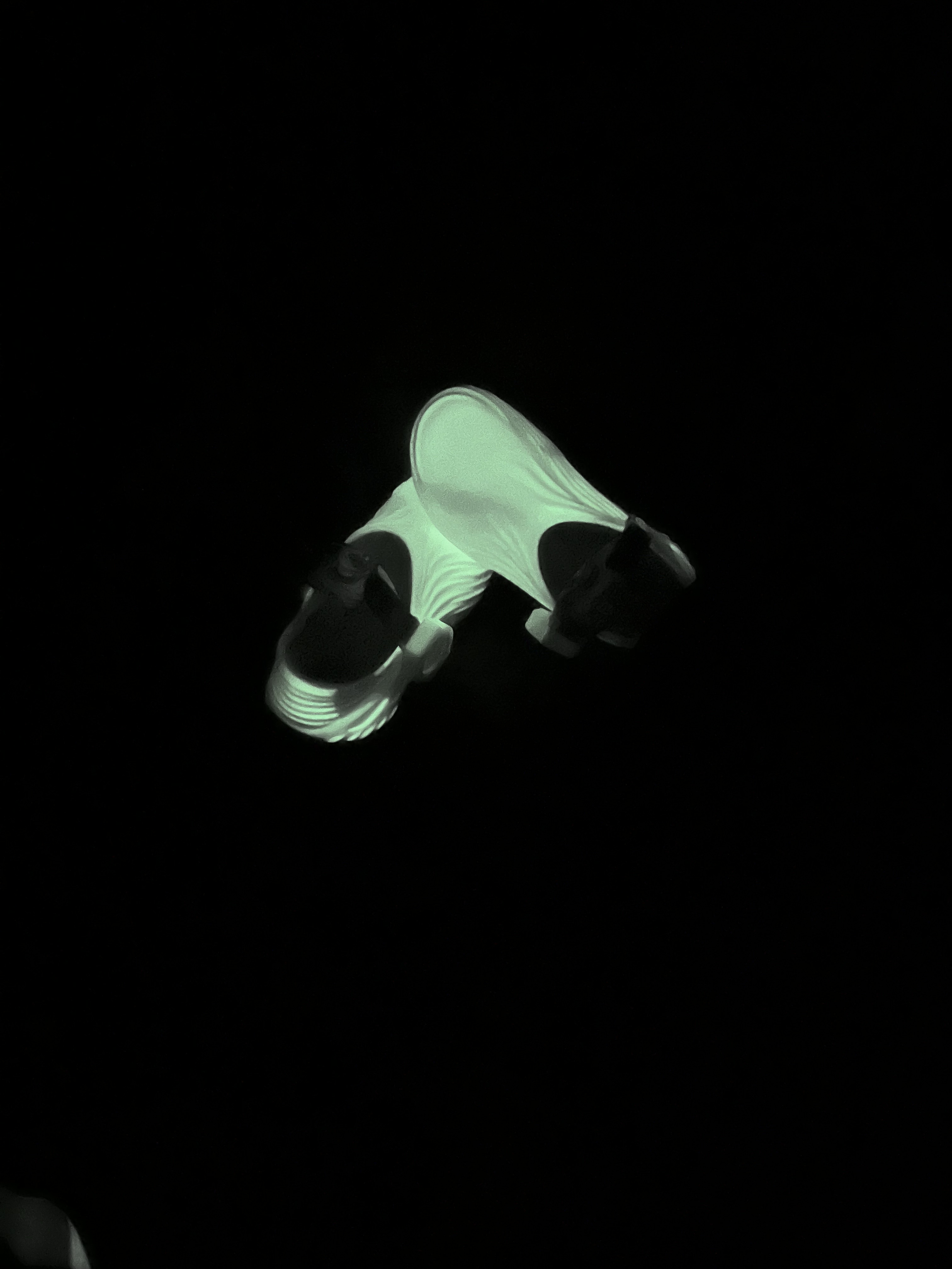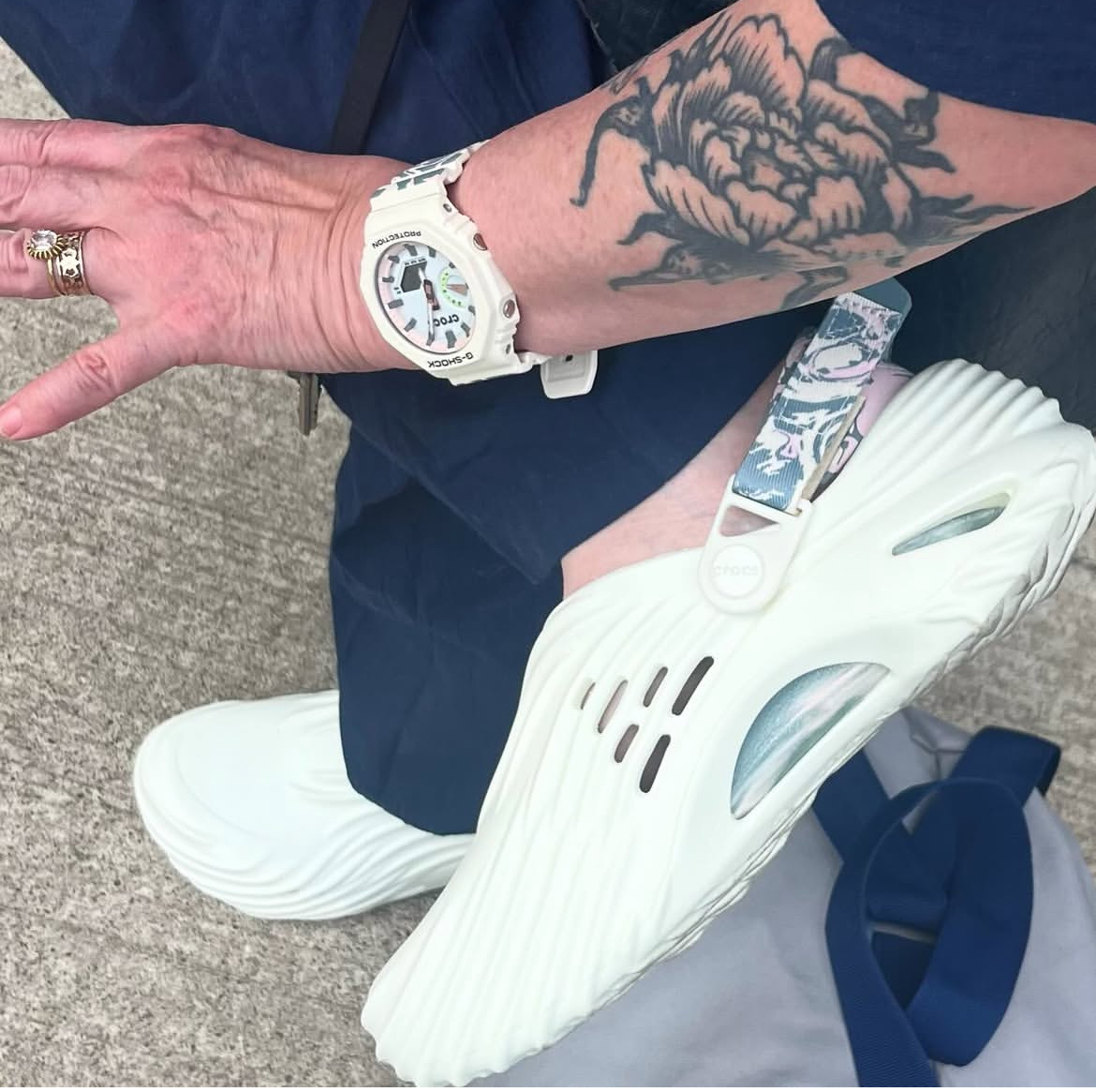 The shoes themselves are a new silhouette. The watch is a Casioak shape in a pale pink. You can take the watch off its strap and attach it to the clog like a Jibbitz. Both glow in the dark.