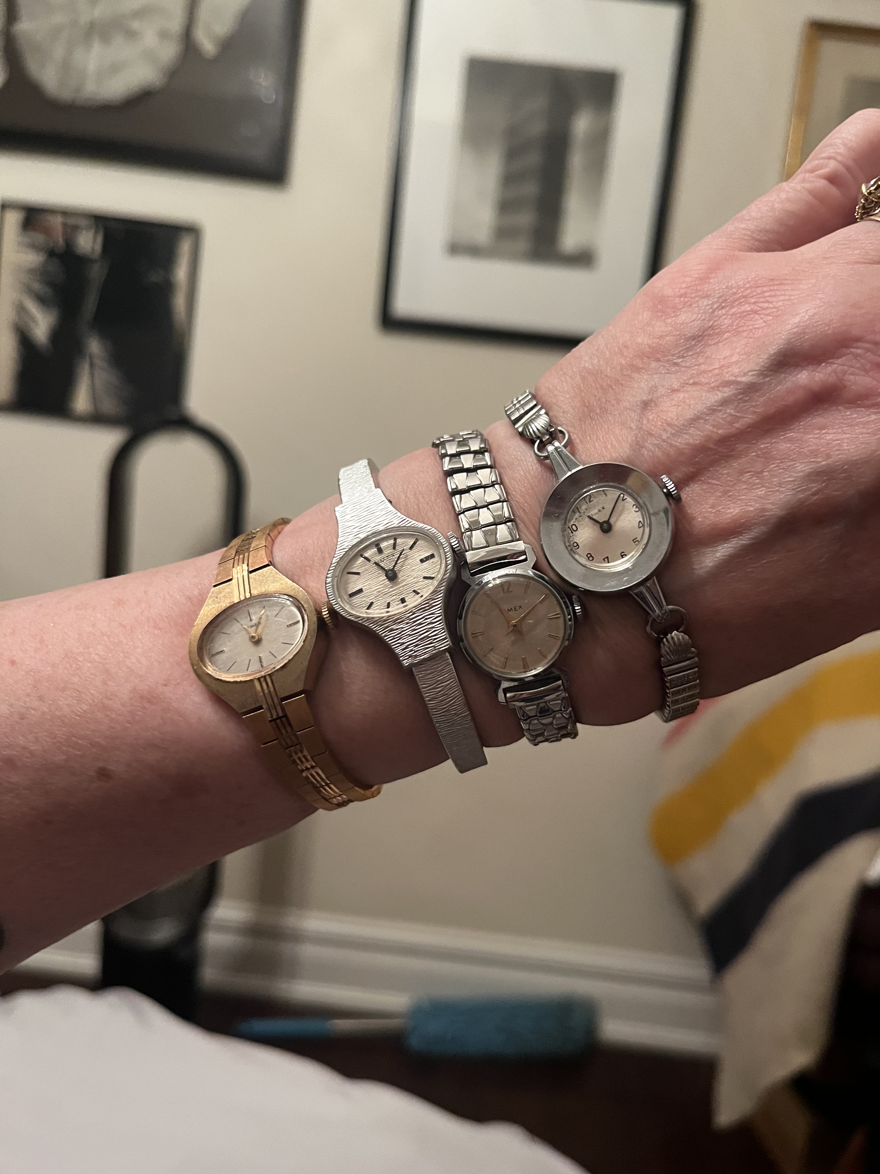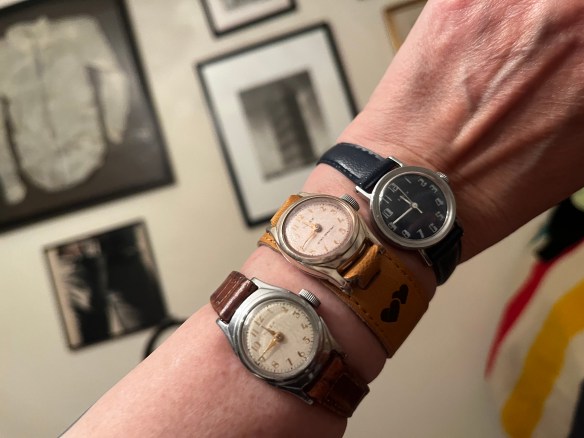 Somehow I’ve amassed a lot of teeny tiny Timex watches. They are all vintage windups. At least two were got swapping with my friend Sarah. Three came with a ten dollar bag of jewelry I got at a community yard sale. And two were found in a cigar box full of watches that I bought last weekend at the National Association of Watch and Clock Collectors in York, Pennsylvania.