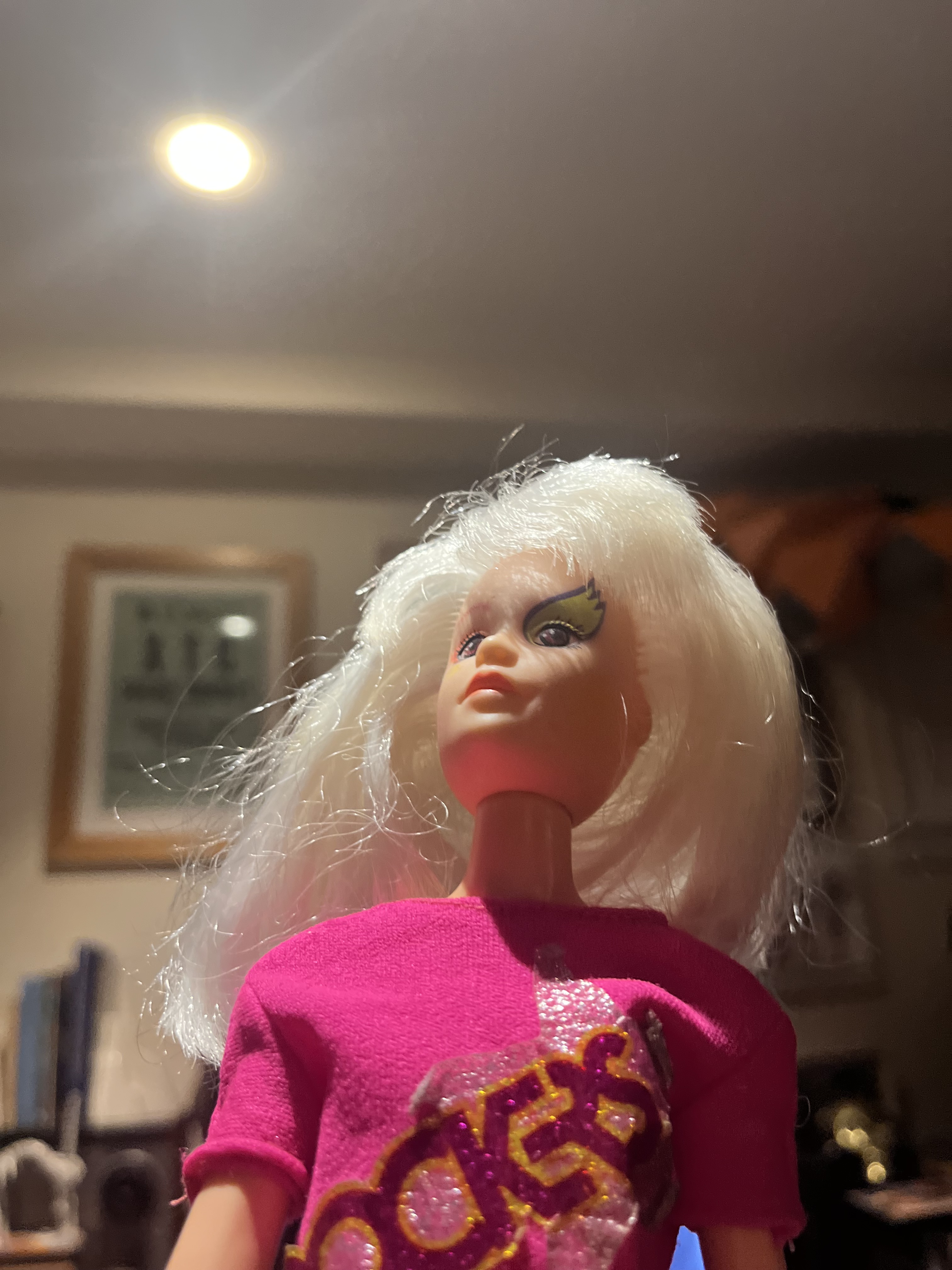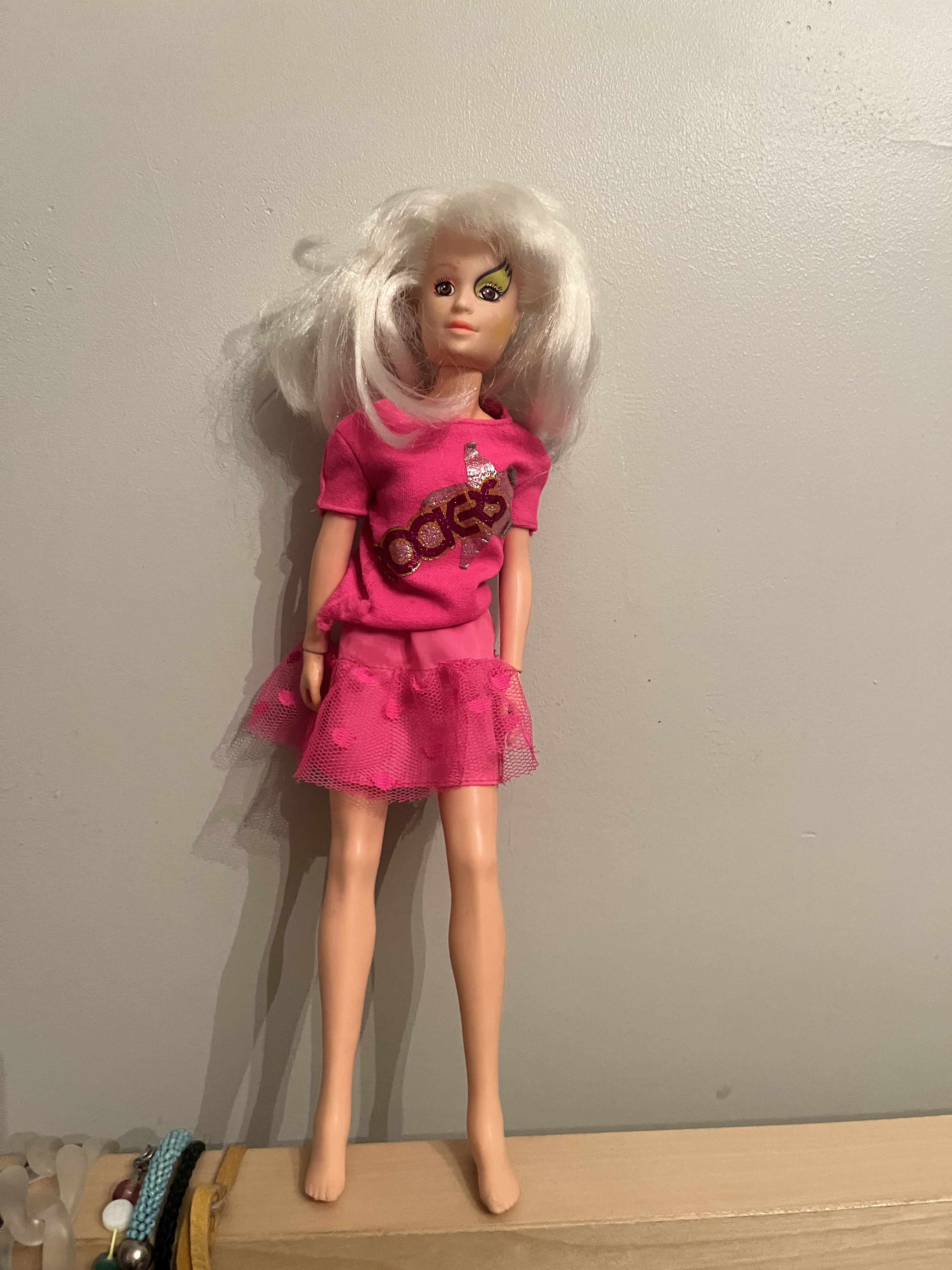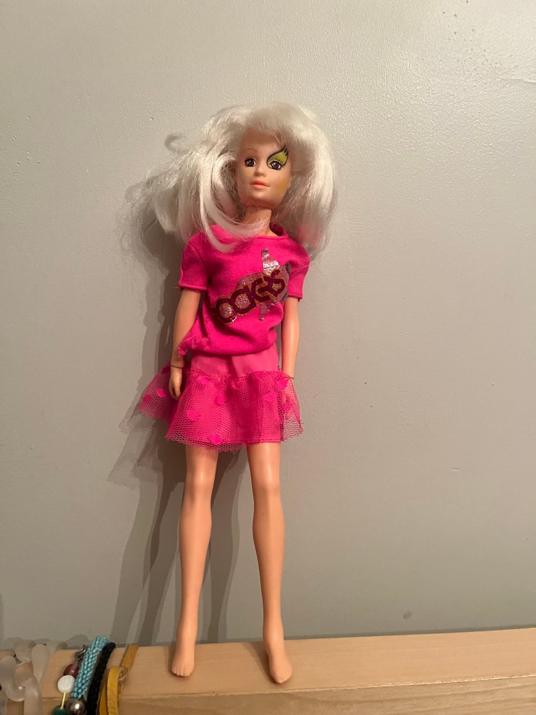 I brought her home because it felt like fate that she would suddenly appear the day after I wrote about these dolls. And since she was naked I dressed her up in some extra Rockers gear because I know that would annoy Jem.