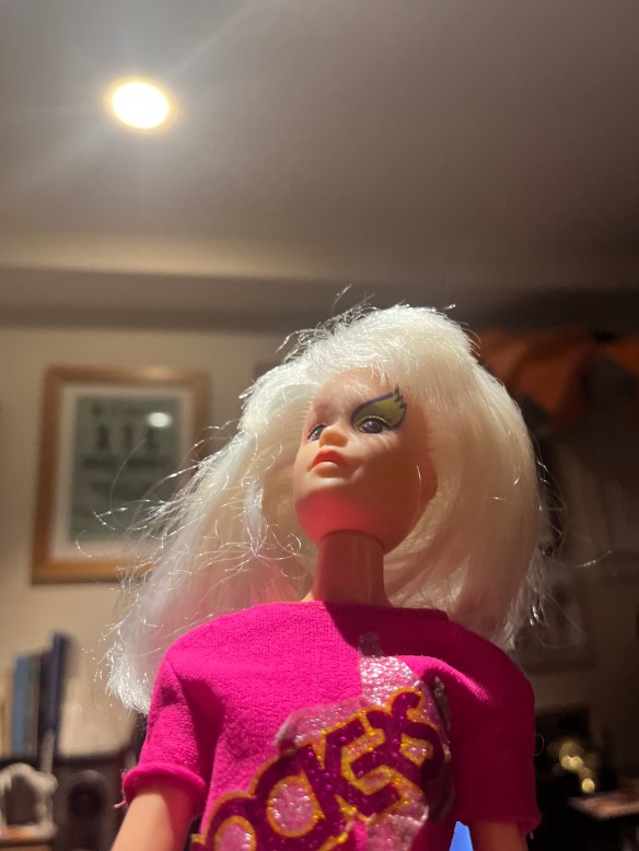 In that post, I posed the Rocker dolls with a Jem doll. Today I visited the Value Village on my way home from a friend’s birthday party and checked out the used toy section in search of celebrity dolls (there was an Emma Watson and Posh, Baby, and Sporty Spices but all four are already represented in my weird collection). I skipped those but brought home a Roxy — the bass player from Jen’s rival band The Misfits!