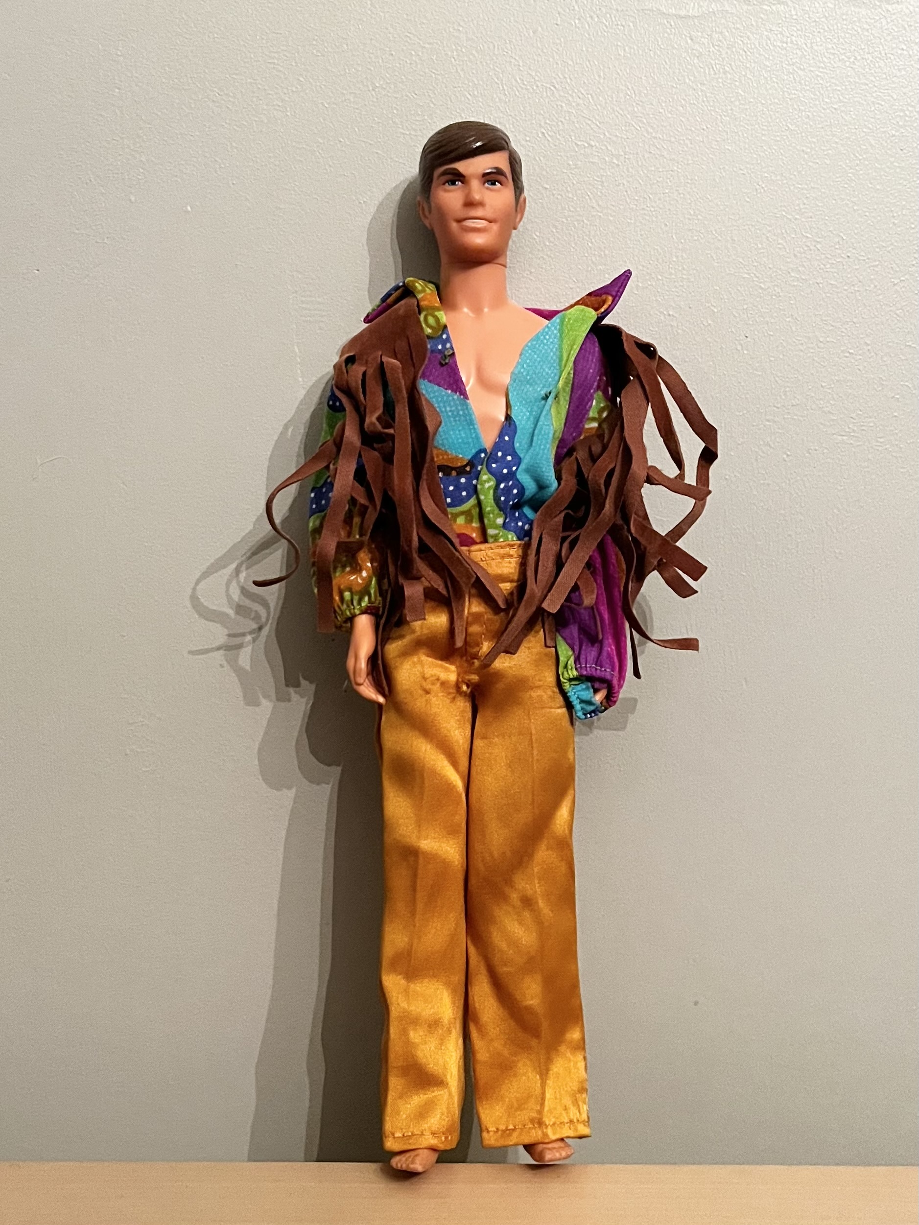 Found a time capsule at the Value Village yesterday. Scattered through the toy section were various fashion dolls and doll clothes dating from approximately 1970 to 1973. Other than the era they represent, a good chunk of the dolls all have some sort of gimmick. Case in point: the Live Action Ken pictured above. Underneath the psychedelic shirt and fringed faux suede vest is an articulated waste. This Ken came with a battery powered “stage” that shooked and shaked making Ken look like he was dancing..