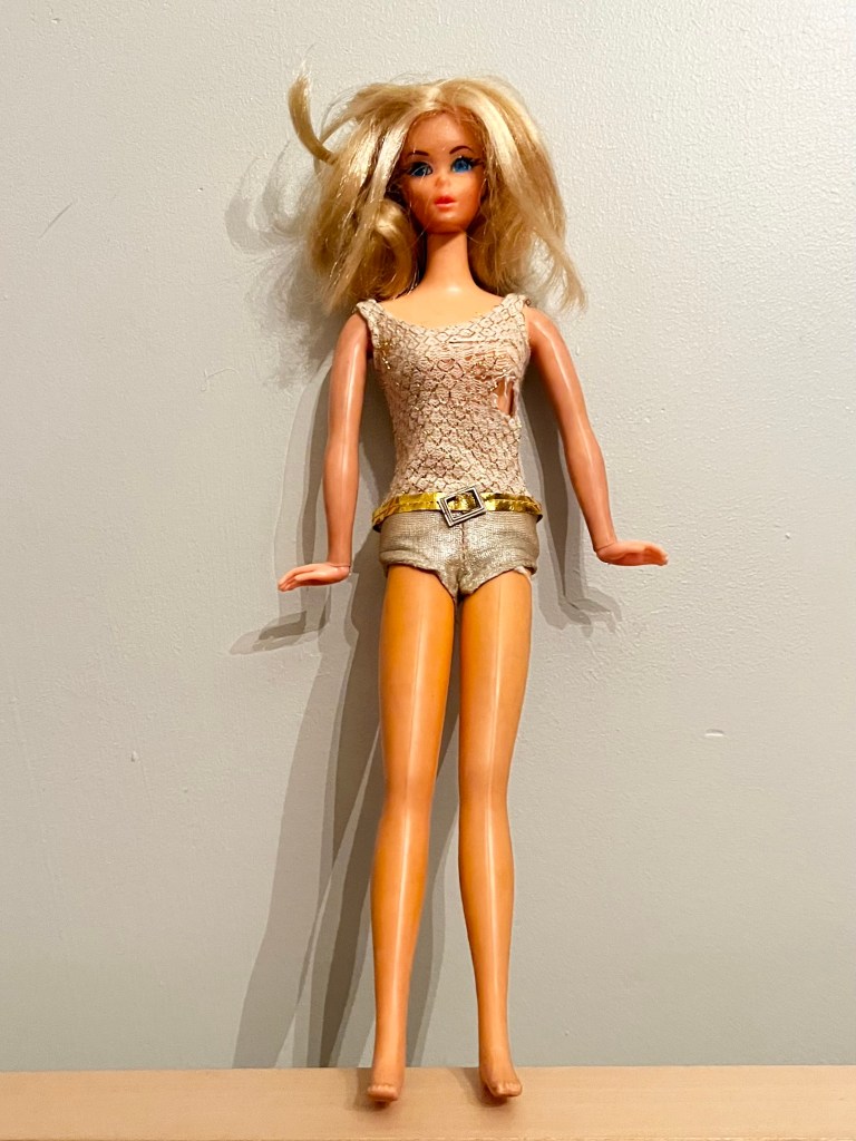 And on the left is Quick Curl Barbie from 1973. Her hair is interspersed with tiny copper filaments, which allow you to “curl” her locks. I had Quick Curl Cara when I was a kid. It didn’t take very long for her locks to get tangled.