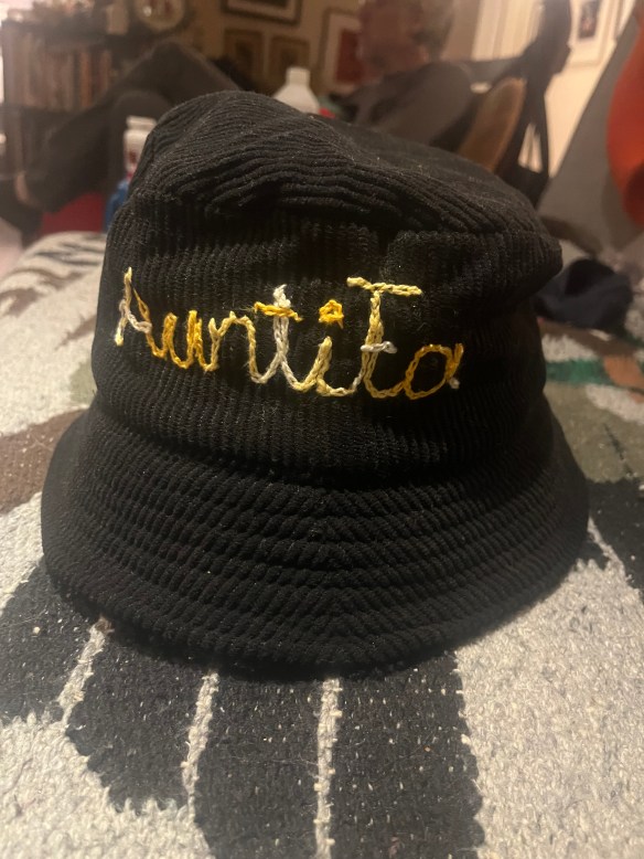 I also chain stitched a bucket hat (also from Dollarama) that I already had with an “AuntieFa” slogan.