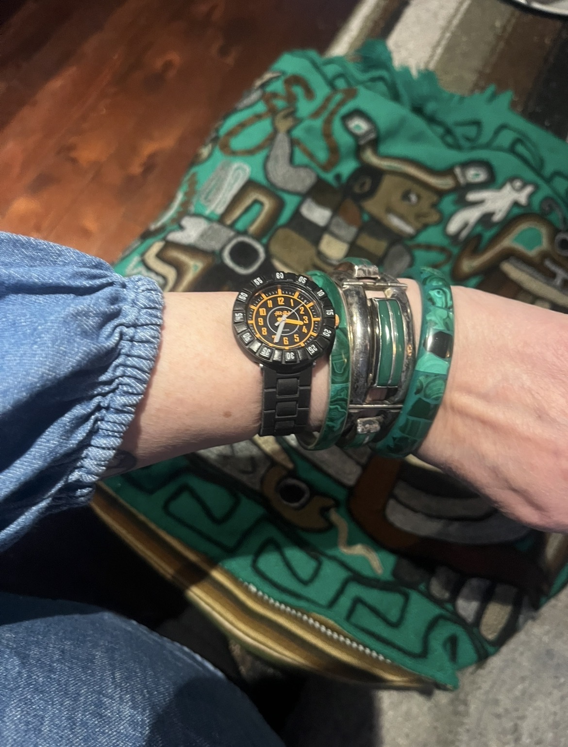 You know I like bracelets and watches so here are some snaps of recent wrist candy acquisitions. For starters, here is a wrist shot of a Flik Flak and a malachite and resin bangle that I found at the Value Village in January. I’ve stacked it with a malachite bangle that I’ve had for eons and a stunning dyed onyx Taxco silver panel bracelet that I thrifted back in December. This bracelet deserved its own post and was probably the best thing I found in all of 2025.