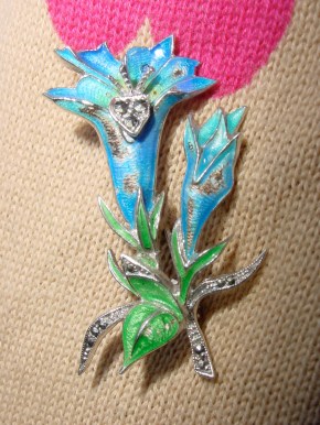 Remember the basse-taille butterflies I posted about yesterday? The brooch pictured above is a different example of basse-taille work. It’s marked “KV 800” (800 is the fineness of the silver out of 1000… Continue reading
